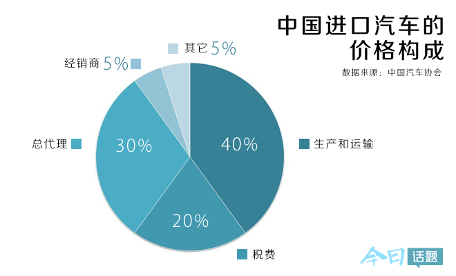 根据中国汽车协会2009年的数据,可以看到对一辆进口车的最终卖价来说,生产和运输成本占40%,关税和消费税平均占比20%(税费/成交价;若以税费比照成本价,则综合税负为50%),总代理经销商的利润占去30%,而其它分销商的利润仅为5%。